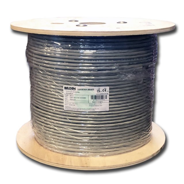 Instalační kabel BELDEN 1633ENH určený pro rozvody strukturované kabeláže. Vhodný pro umístění do vnitřního prostředí. BELDEN 1633ENH F/UTP drát CAT5E LSOH,Dca 305m šedý - cat.5e - třída D (100MHz) - 4 x 2 x AWG24/1 Provedení F/UTP - stínění jednotlivých párů: ne - stínění celkové: ano - typ vodiče: drát - materiál vodiče: měď - materiál izolace jednotlivých vodičů: PE 1.05 mm - zemnící vodič: ano - odplášťovací lanko (ripcord): ne - plášť PVC - průměr pláště 6.0 mm ± 0.2 mm - reakce na oheň: Dca-s2,d2,a1 - barva pláště: šedá - průmyslový potisk: ano (potisk typ + metráž) - značení metráže ano, po metrech Balení - 305 m BOX - hmotnost: 12 kg