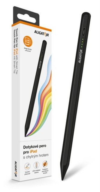 Aligator dotykové pero pro iPad s chytrým hrotem, černé Pracujte s dotykovým perem Aligator jako s klasickou tužkou. Díky přirozené odezvě, citlivosti chytrého hrotu na přítlak i náklon je Aligator dotykové pero naprosto nepostradatelným parťákem. Práce na Vašem iPadu nebyla nikdy jednodušší! Klíčové vlastnosti: *kompatibilní se systémem iOS a iPadOS *chytrý hrot *simulace práce na klasickém papíře *vysoká přesnost dotyku s nulovou odezvou zpoždění *skryté magnetické uchycení - možnost přicvaknutí na kovovou základnu iPadu *detekce položené ruky *funguje bez potřeby párování s iPadem *LED indikátor baterie *žádné škrábance *až 4 hodiny provozu na 1 nabití (nabíjení cca 40 minut) *USB-C konektor *náhradní hrot a nabíjecí kabel v balení Parametry: Funkce: *detekce položené ruky (Palm Rejection) *nízká latence *vyměnitelný hrot *LED indikátor baterie Výdrž baterie na jedno nabití: až 4h Doba nabíjení baterie: cca 40min (USB-C konektor) Kompatibilita: kompatibilní se systémem iOS a iPadOS Výrobce: Aligator Barva: černá Obsah balení: *dotykové pero *náhradní hrot *nabíjecí kabel (USB-C) *stručný návod k obsluze Záruka: 24 měs.